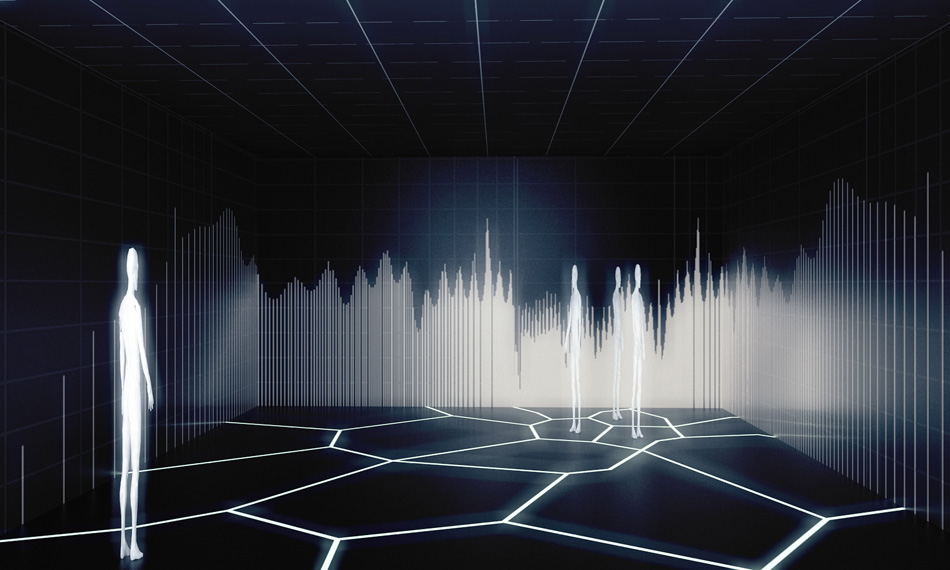 A “Sensitive Space” by ORTLOS is a prototype for the space which goes beyond the imagination. A Space which underlies Georg Flachbart’s pledge for “disappearing architecture”, it radically expands the Jacques Lacan’s “other” and it is build utterly out of information: light, visual image and audio. Nothing haptic. A meta-machine is tracking the position of the visitors within the space and triggers the composition fragments thereafter.